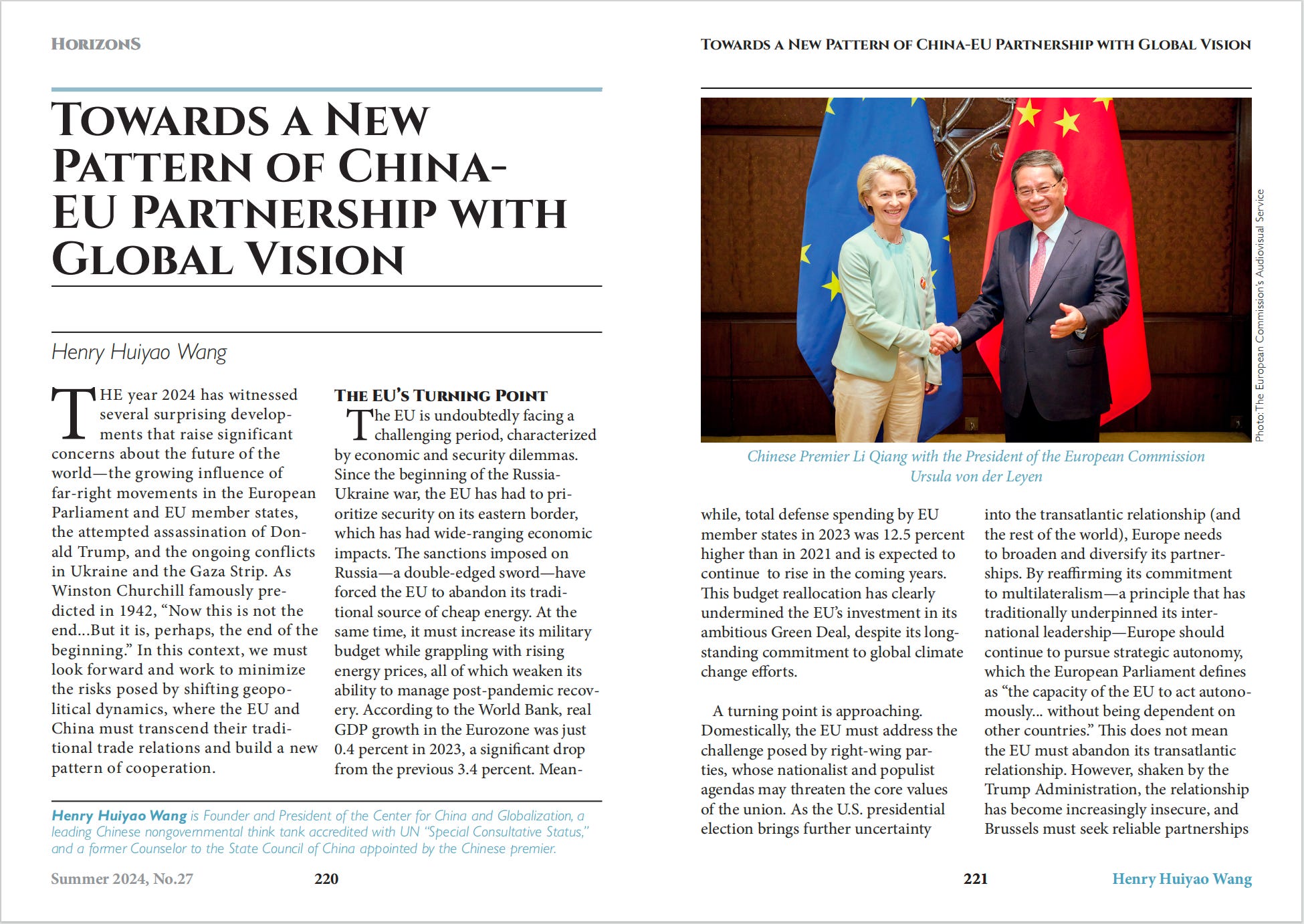 Henry Huiyao Wang's article in Horizons Summer 2024 / Issue No. 27, a journal of international relations and sustainable development run by the Center for International Relations and Sustainable Development (CIRSD), Belgrade, Serbia.