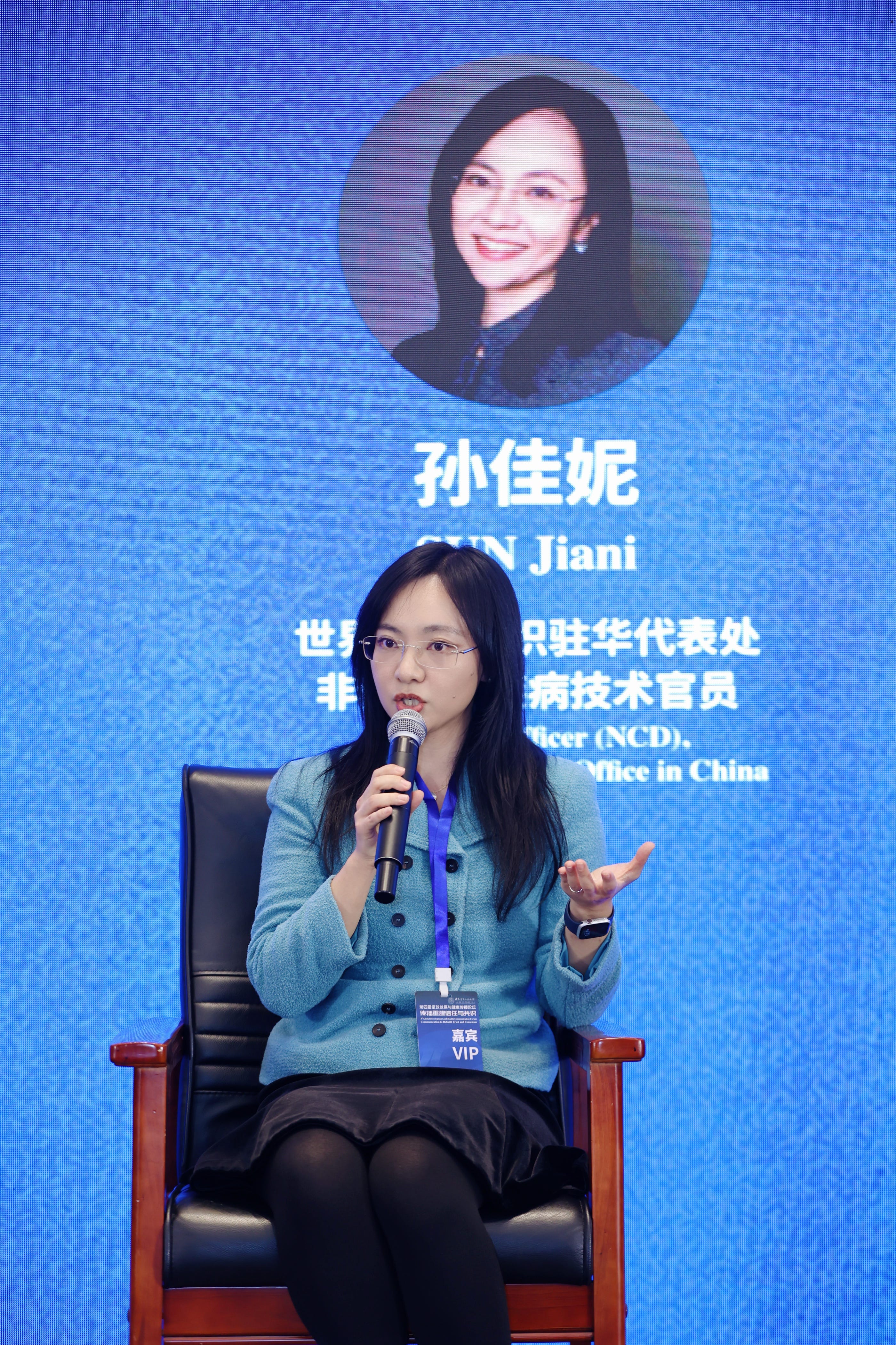 And last but not least, Ms. Sun Jiani — someone I’ve known for more than ten years. She is currently a Technical Officer at the WHO Representative Office in China. When I first met her more than a decade ago, she was working on tobacco control and communications at the same time. Later she was transferred to the WHO Western Pacific Regional Office and then spent a short stint at the WHO Mongolia office. Now she’s focusing on noncommunicable diseases (NCDs) at WHO China.
