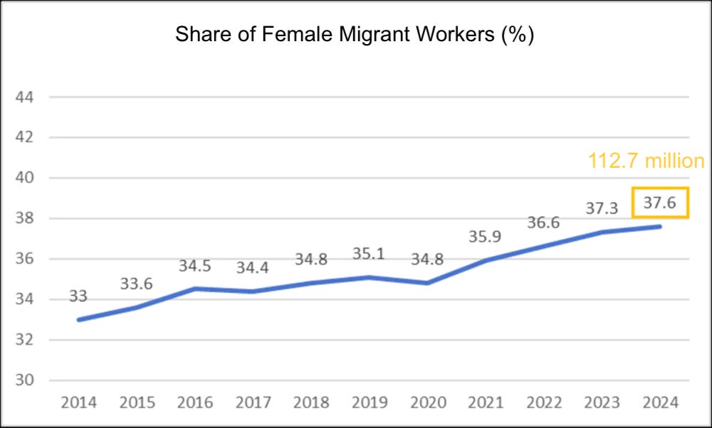 Thus, the economic pressure naturally shifts onto the shoulders of women workers. According to the National Bureau of Statistics, the number of female migrant workers has continued to rise over the past decade, reaching 112.7 million in 2024.