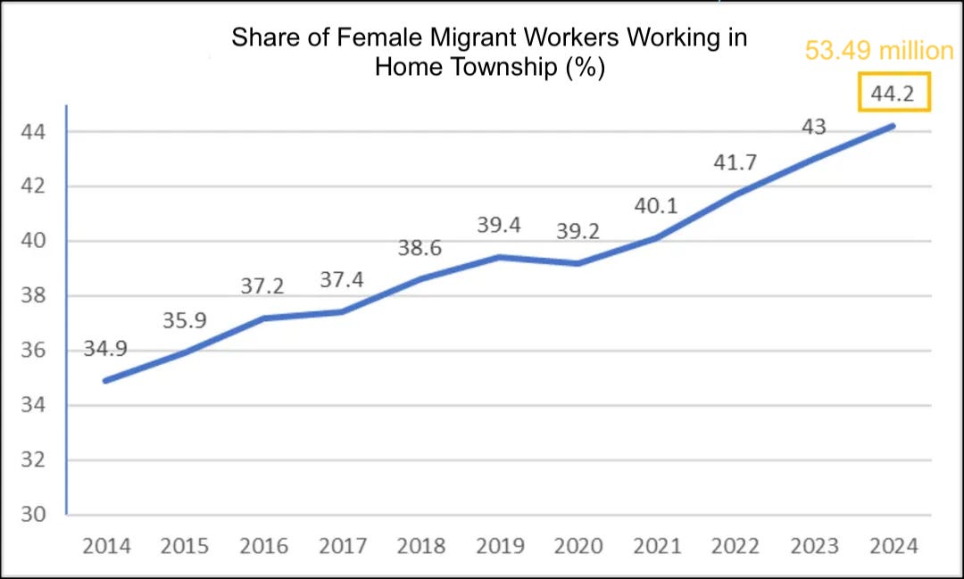 Data show that among locally based migrant workers, the number of women has risen rapidly. Over the past decade, the proportion has increased by nearly 10 percentage points, surpassing 50 million. A substantial portion of these are young mothers who returned home to accompany their children’s schooling.