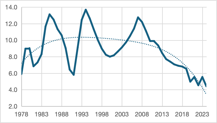 Figure 2 plots GDP growth from the start of reform and opening up in 1978 through 2024, using National Bureau of Statistics data. To smooth short-term volatility and clarify the longer-term trend, the series is presented as a three-year moving average. As the chart shows, China’s growth rate rose quickly from below 6 per cent in 1978 to around 10 per cent in the early 1980s, and then remained at roughly that pace for more than three decades.
