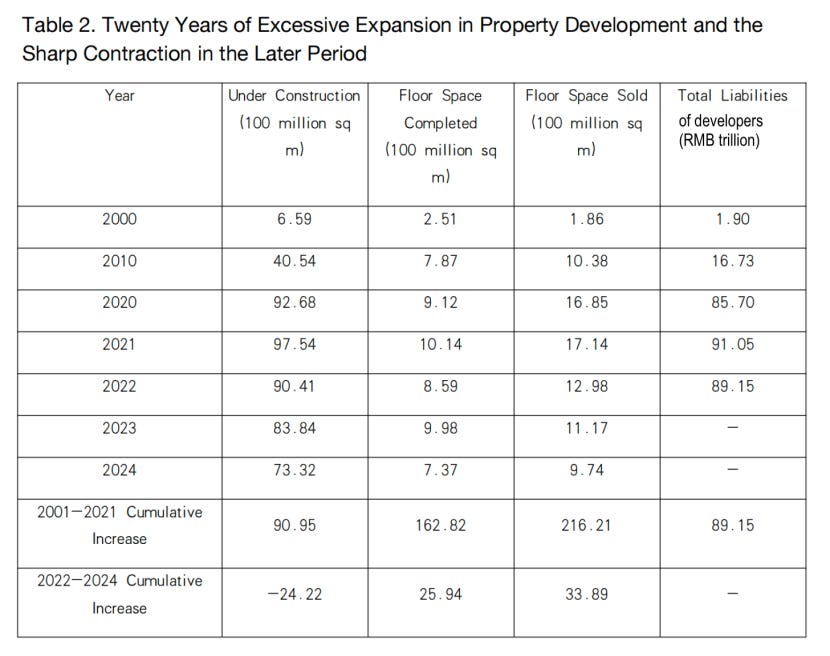 Note: 2022 marked a turning point for the property sector, so the cumulative increase reported in the table is split into two periods, 2001–2021 and 2022–2024. Floor space under construction and total liabilities are stock variables, so their cumulative increase is measured as the value in the final year minus the value in the year immediately preceding the period. Floor space completed and floor space sold are flow variables, so their cumulative increase is measured as the sum of annual values over the period. A dash indicates that no data are available.