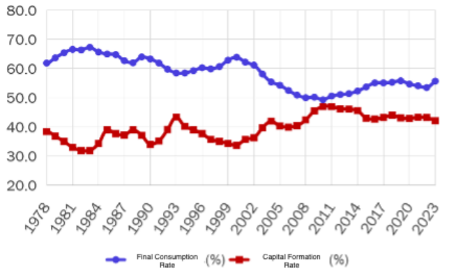 The investment rate and consumption rate data cited here are drawn from the National Bureau of Statistics, China Statistical Yearbook 2024. However, the National Bureau of Statistics has repeatedly revised the historical data for both the investment rate and the consumption rate. For example, the investment rate for 2010 was initially published as 48.6 per cent, and was later revised down several times to 48.1 per cent, 47.9 per cent, 47.0 per cent, and 46.5 per cent. The consumption rate was initially published as 47.4 per cent, and was later revised up several times to 48.2 per cent, 48.5 per cent, 49.3 per cent, and 49.9 per cent. The investment rate for 2020 was initially published as 43.1 per cent, and was subsequently revised down to 42.9 per cent and 42.3 per cent; the consumption rate was initially 54.3 per cent, and was subsequently revised up to 54.7 per cent and 55.4 per cent. The investment rate for 2023 was also revised down from the originally published 42.1 per cent to 41.1 per cent, while the consumption rate was revised up from the originally published 55.7 per cent to 56.8 per cent. All of these revisions moved in the same direction: lowering the investment rate and raising the consumption rate. None of these revisions to the historical data was accompanied by an explanation of the reasons for the revision. Here, the author uses the data from the China Statistical Yearbook 2024 and does not adopt further revisions.