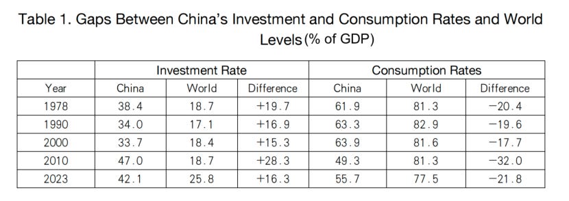 Against global benchmarks, China’s investment rate was about 20 percentage points above the world average, while its consumption rate was about 20 points below it in 1978. By 1990 and 2000, the investment rate was about 17 and 15 percentage points above the global level, and the consumption rate about 19 and 18 percentage points below it, respectively. Thereafter, the trend reversed. By 2010, China’s investment rate stood 28 percentage points above the world average, while its consumption rate was 32 percentage points below it. By 2023, the gap remained: China’s investment rate was still 16 percentage points above the global level, and its consumption rate 22 percentage points below it.4