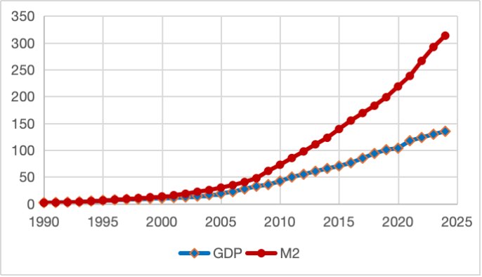 Figure 1 compares the growth of M2 and nominal GDP since 1990. The gap widened markedly over time, especially after 2008. By 2024, nominal GDP was under RMB 135 trillion, while M2 had risen above RMB 313 trillion, leaving M2 at more than 2.3 times the size of GDP.