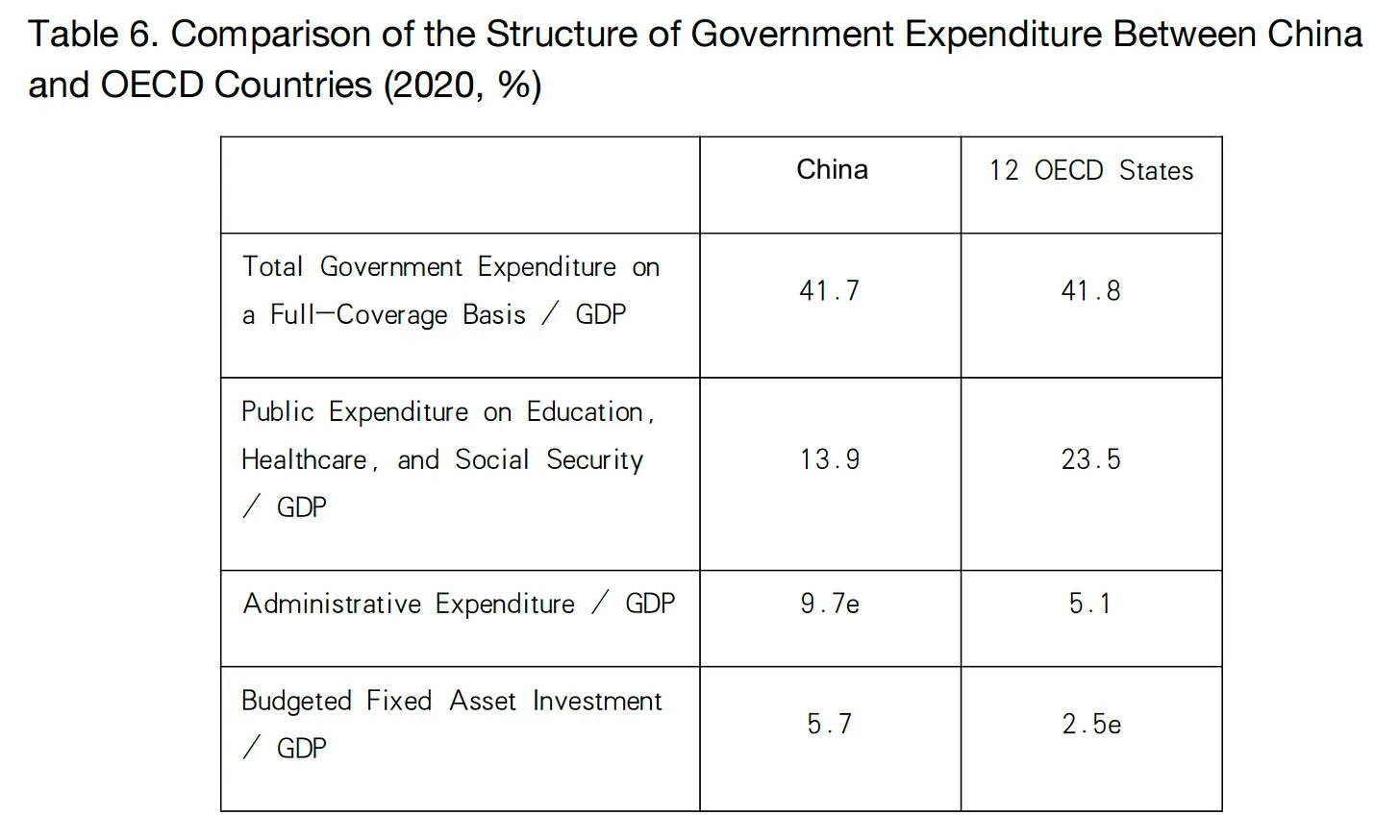 First, spending on public services—education, healthcare, and social security—amounts to just 13.9 per cent of GDP in China. Across the 12 OECD countries in Table 6, the average is 23.5 per cent, nearly 10 percentage points higher.